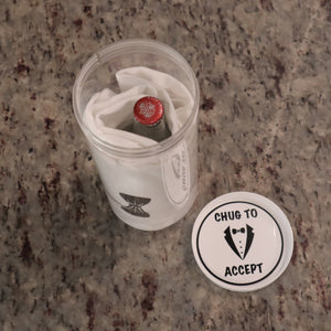 Make your groomsmen proposal unforgettable with this clever icebreaker gift set. The premium cotton-blend shirt pairs with a branded "Chug to Accept" sticker and reusable plastic cylinder—the perfect vessel for pairing with your groomsman's favorite beverage.