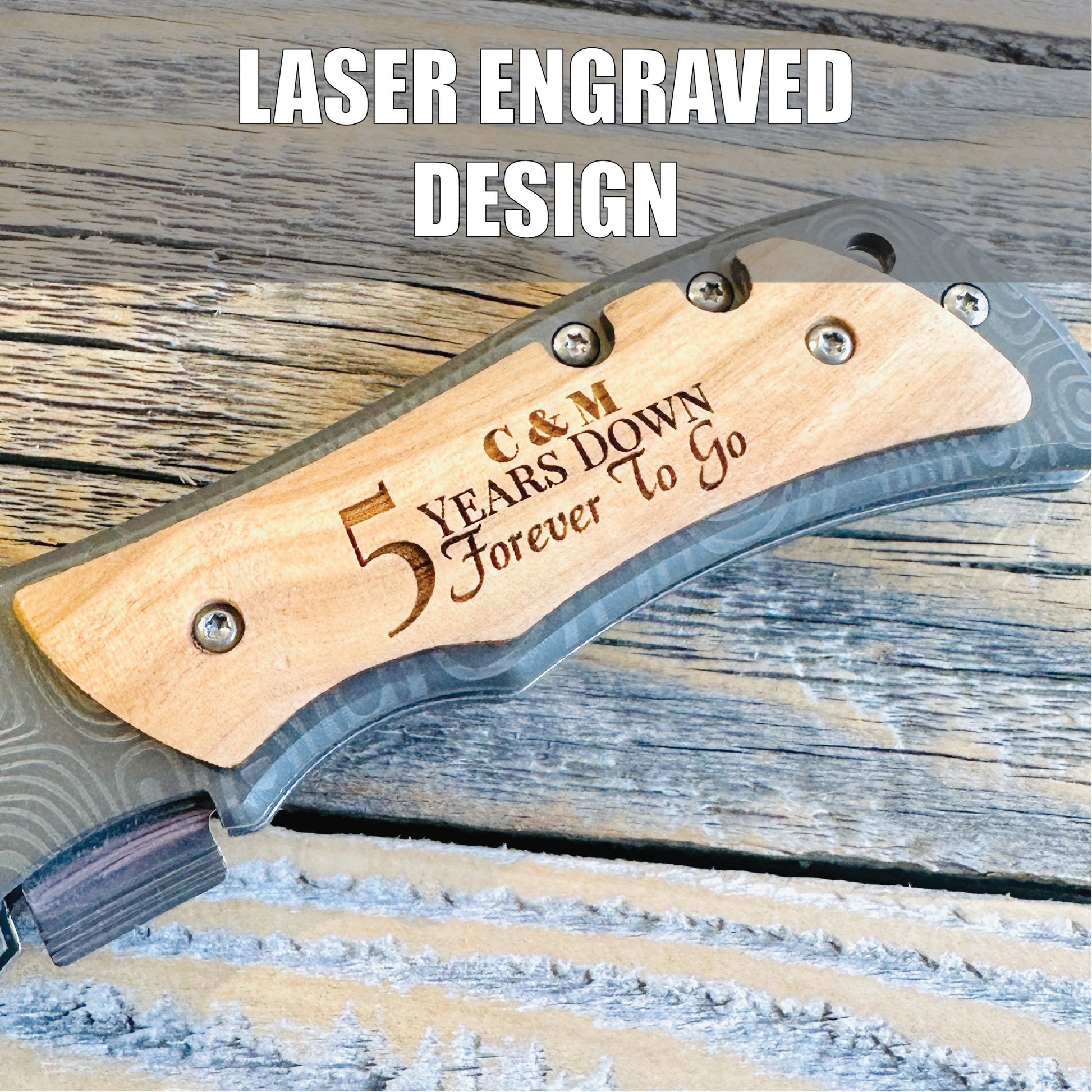 Choose between two engraving styles—Anniversary style with initials and years, or Cupid's Arrow style with custom messages—making each knife unique to your crew.