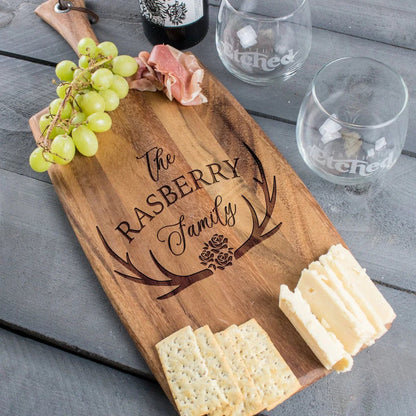 This Antler & Flowers Cheese Board makes a distinctive groomsmen gift that combines rustic elegance with practical entertaining utility. Each board features laser-engraved antler and floral artwork alongside a custom family name, creating a personalized serving piece your groomsmen will proudly display.