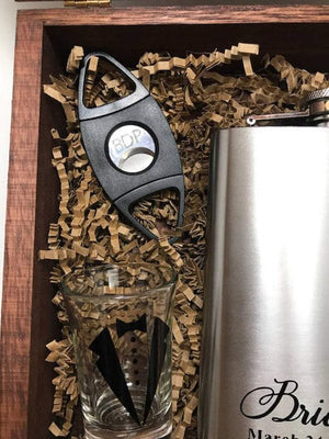 • Application Method: Flask features permanent vinyl personalization; cigar cutter includes etched initials