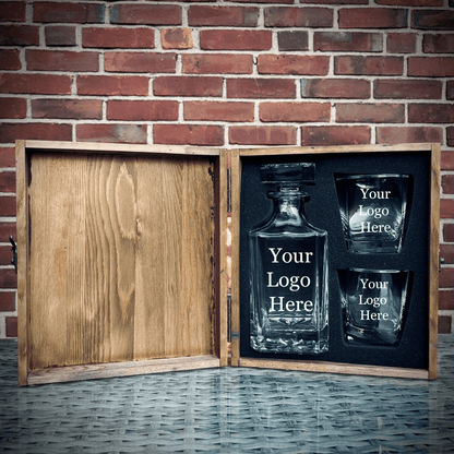 Elevate your gifting game with the Logo Decanter Box Set, a luxurious collection designed for whiskey lovers and connoisseurs. This stunning set features a personalized decanter, matching whiskey glasses, and a custom wooden box, all engraved with your unique logo. Perfect for corporate events, special occasions, or thoughtful personal gifts, this set blends sophistication and practicality.