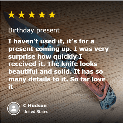 Thank you so much for your kind words! We’re thrilled to hear that you love your knife—it truly means the world to our team. We hope to help you again in the future when you’re looking for the perfect gift!
