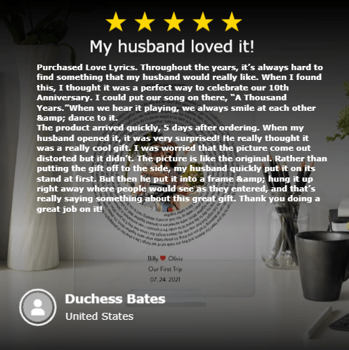 Fantastic ordering experience! Shipping was almost immediate, I was so surprised. The quality is outstanding. My husband was so moved by the gift!