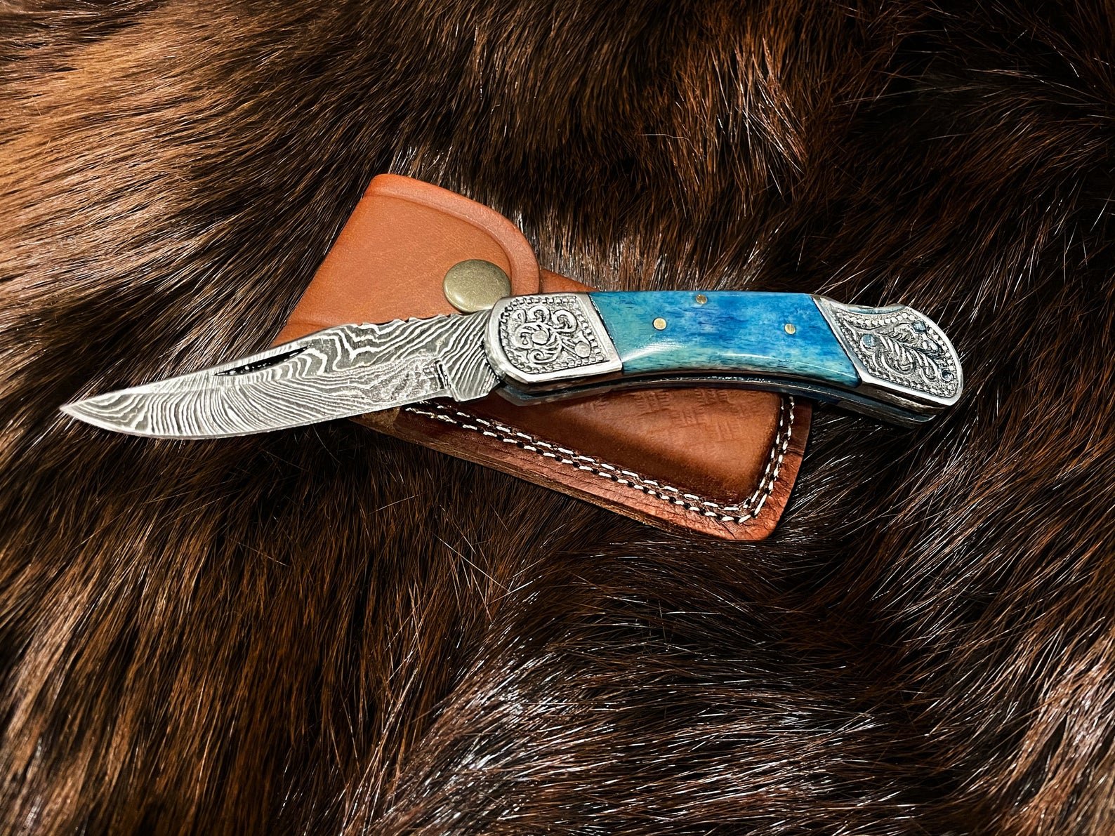 Stand out with this Damascus pocket knife featuring a distinctive dyed blue bone handle that makes every piece unique.