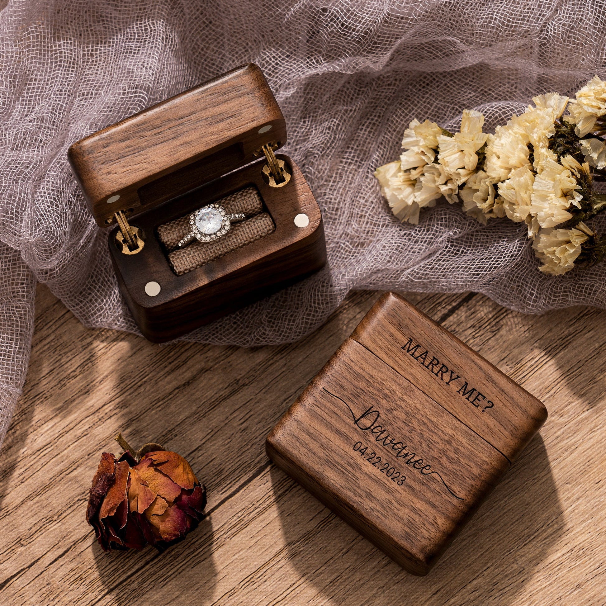 Present the engagement ring in a personalized wooden ring box that becomes a lasting keepsake after the proposal.