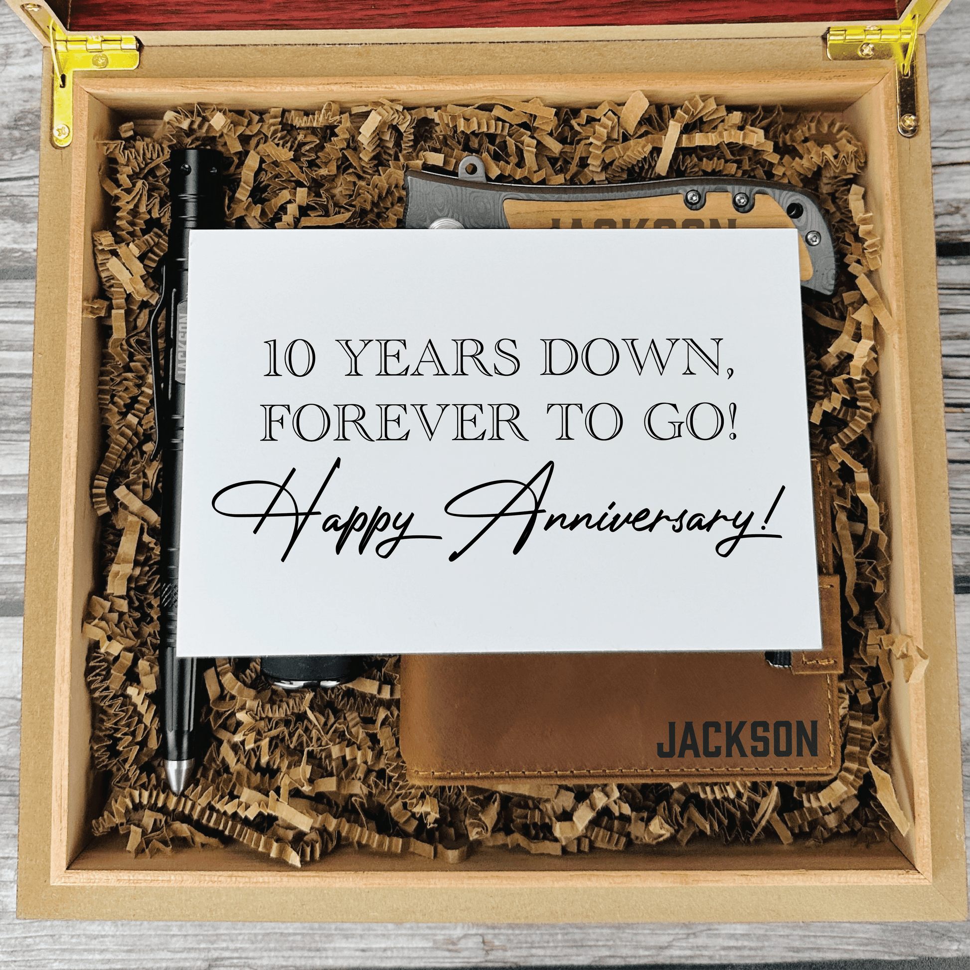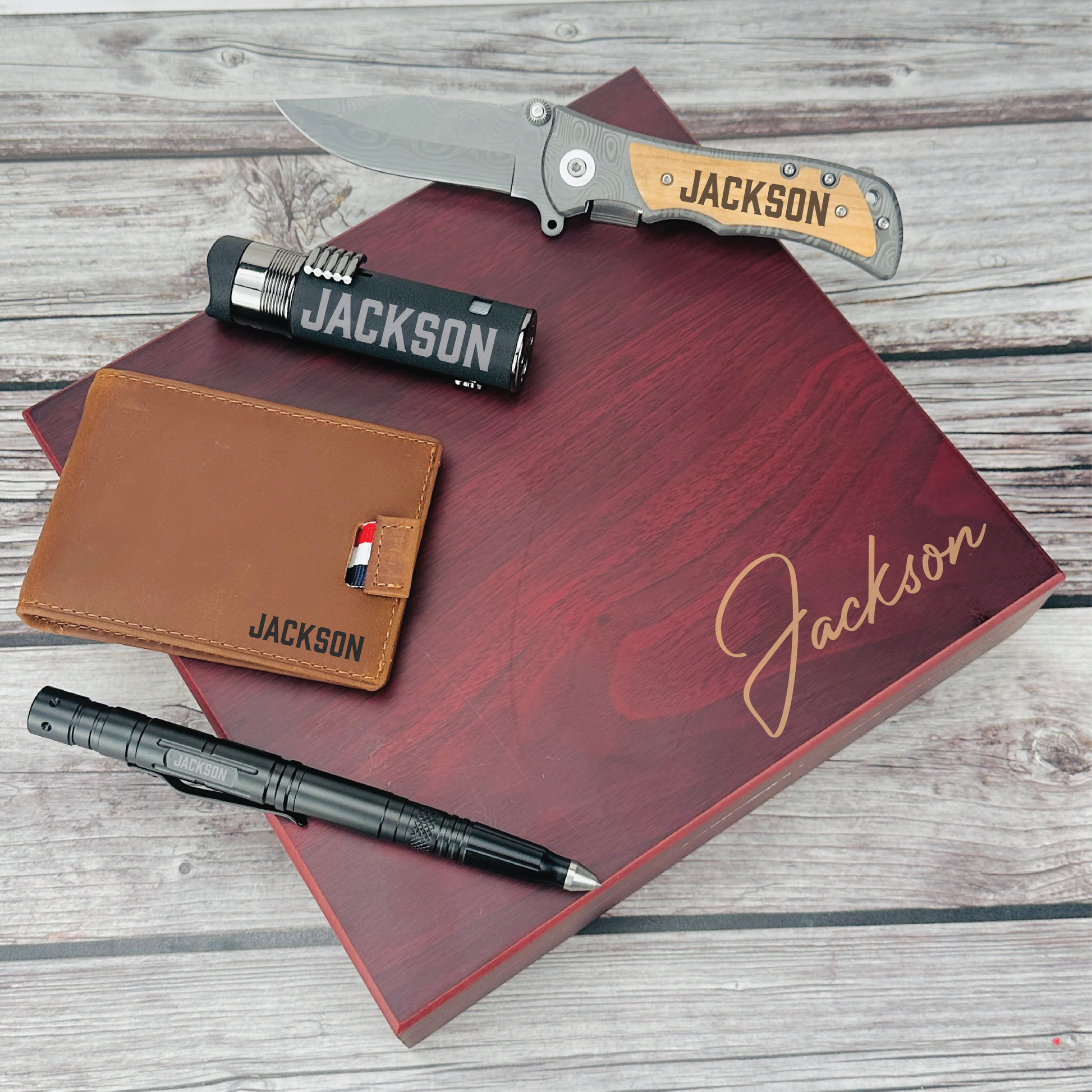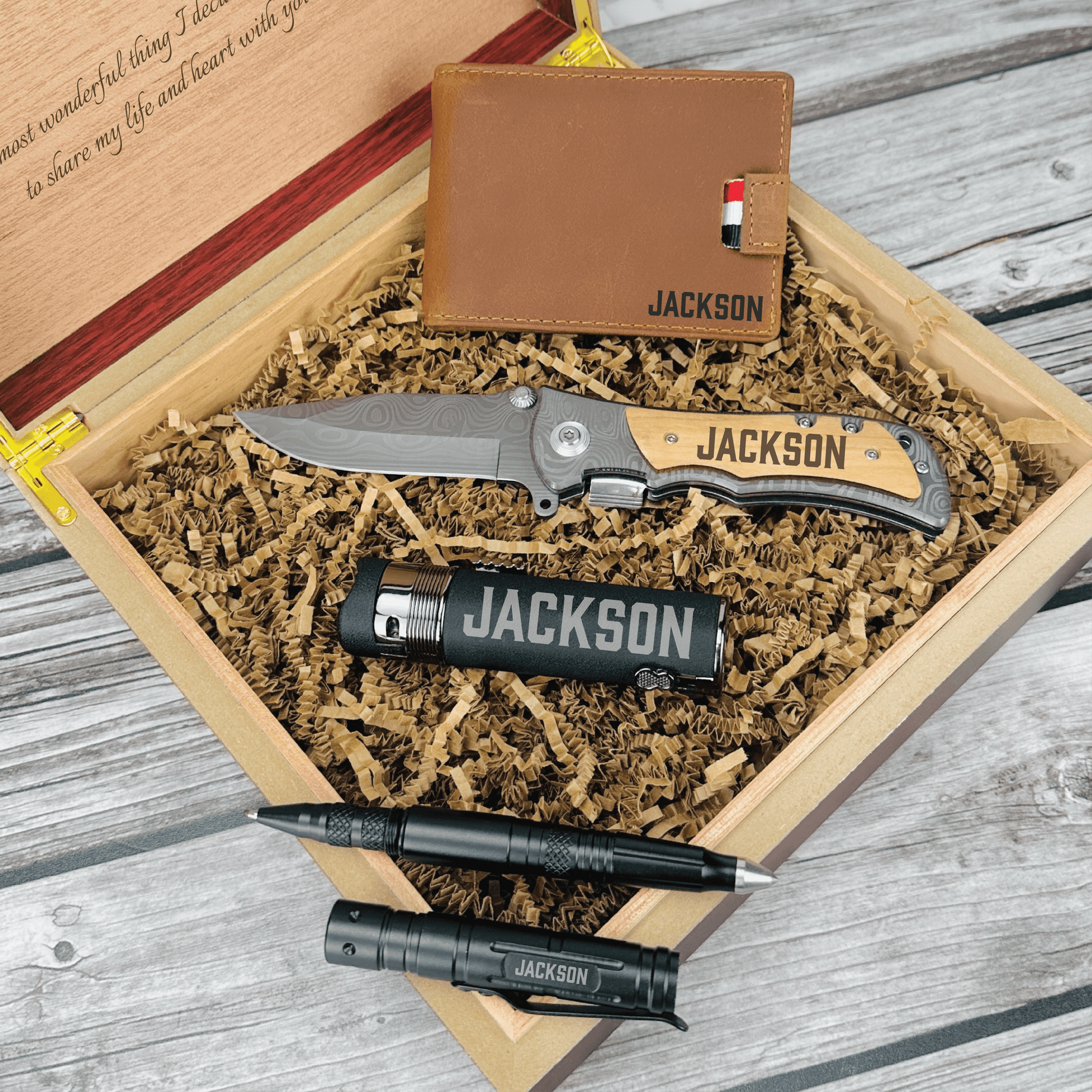 Give your groomsmen this exceptional five-piece gift set featuring tactical pen, premium torch lighter, leather wallet, precision folding knife, and Spanish cedar-lined wooden box.