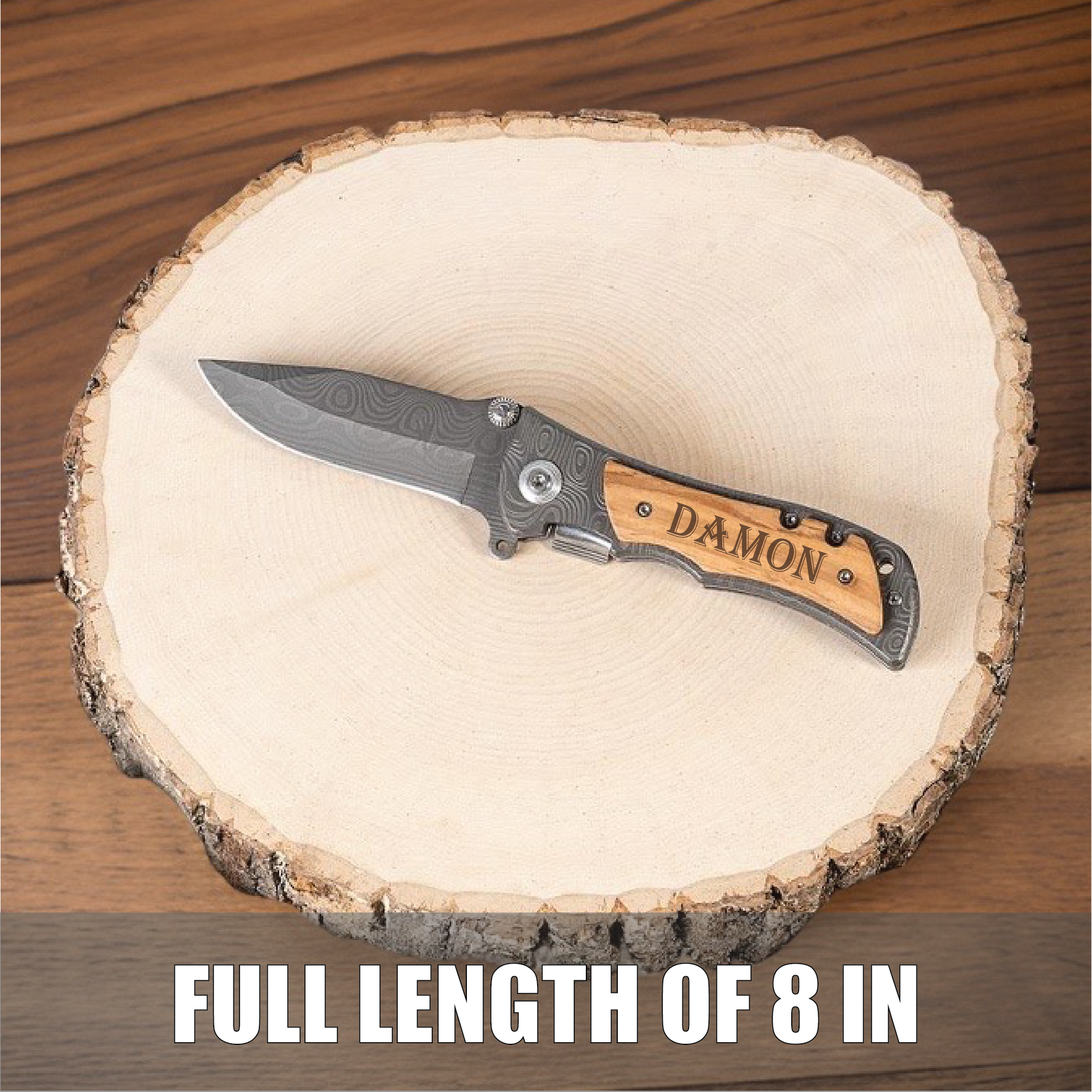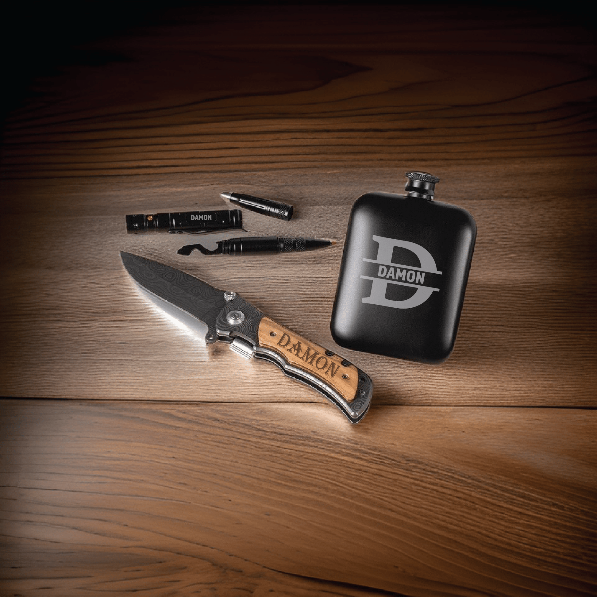Surprise your groomsmen with the Gentleman's Essentials Box Set, a premium four-piece collection featuring a personalized bi-fold leather wallet, an engraved Damascus-style knife, a stainless steel hip flask, and a tactical pen—all presented in a Spanish cedar-lined wooden humidor box.
