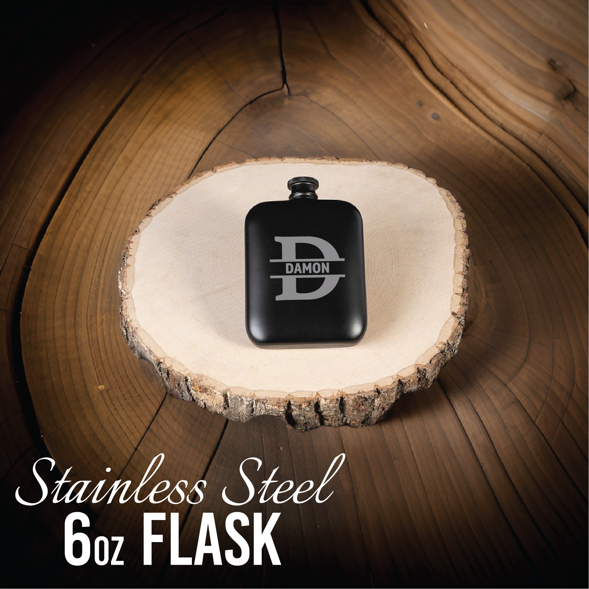 - Flask Materials: Stainless steel with black coating, engraved in the USA