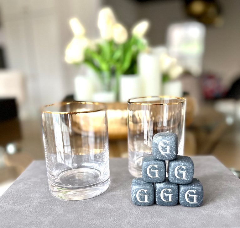 Give your groomsmen a sophisticated whiskey experience featuring gold-rimmed low ball glasses and natural soapstone whiskey stones that chill drinks without dilution.