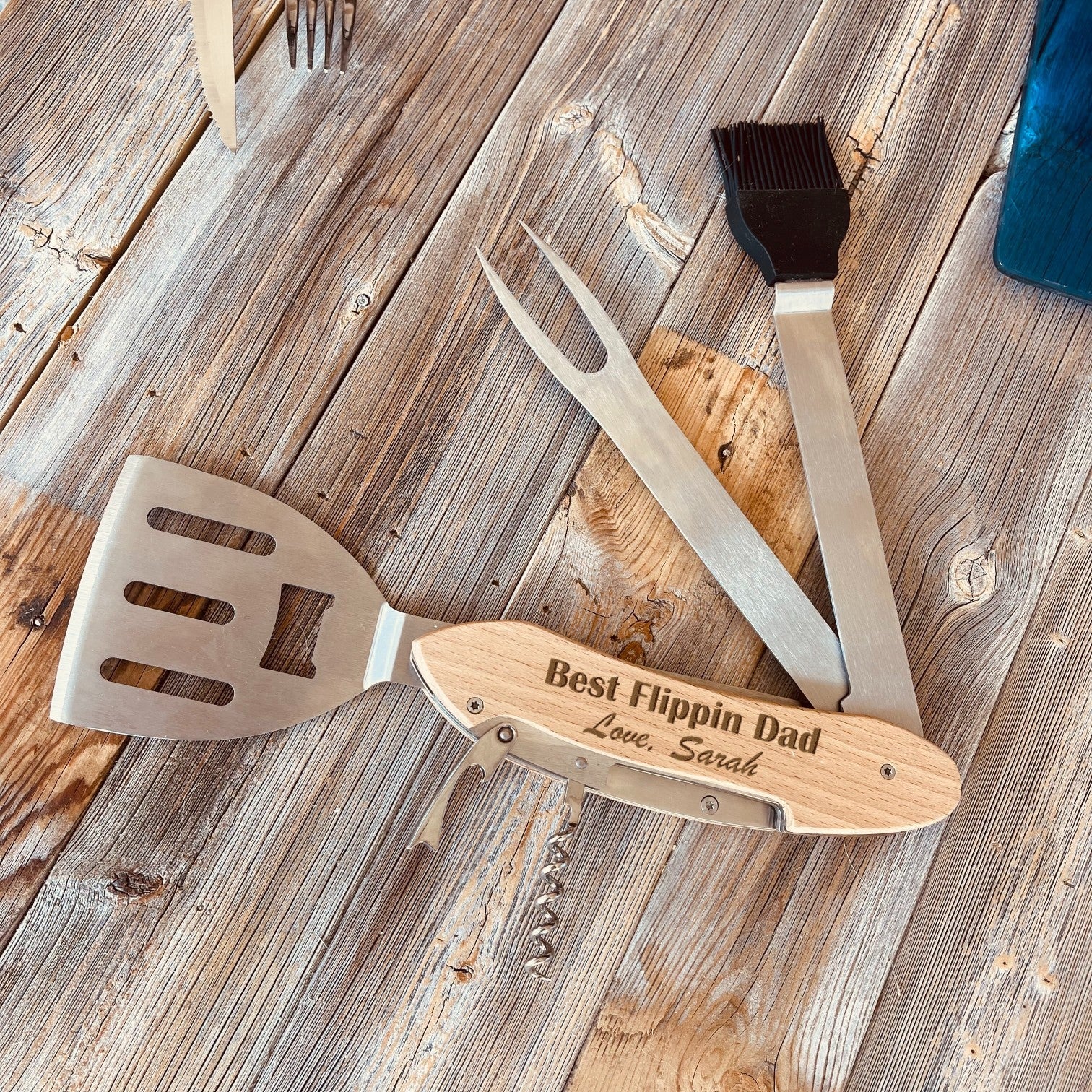 Give your groomsmen the ultimate backyard essential with this versatile 5-in-1 BBQ grill tool that combines functionality with personalized style. Crafted from durable beech wood and stainless steel, this professional-grade tool features a spatula, basting brush, fork, wine bottle opener, and bottle opener all in one compact design.