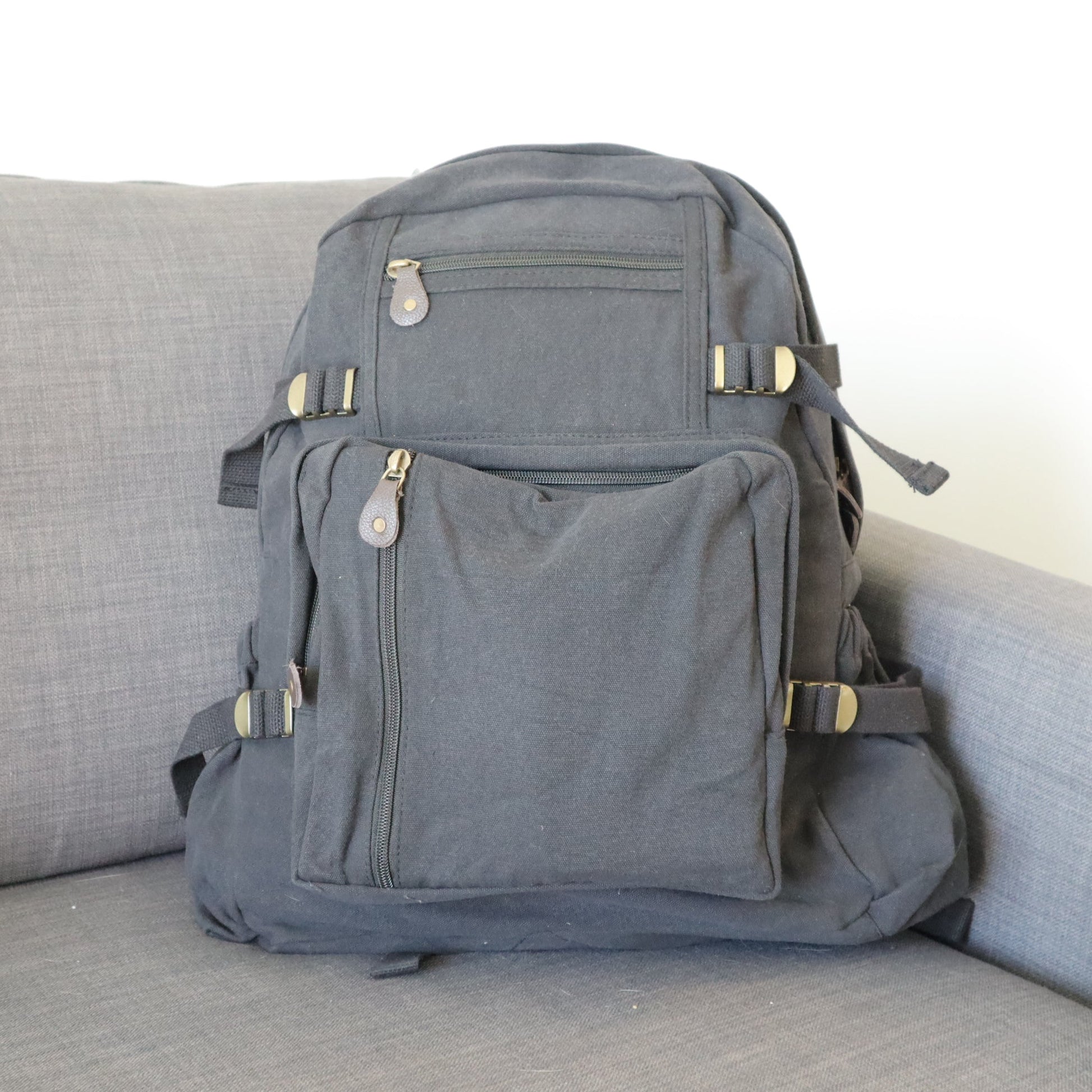 This classic-style backpack features vintage washed cotton canvas construction with one large main compartment, three outside zippered pouches, and two elastic side pockets with tie-down straps.