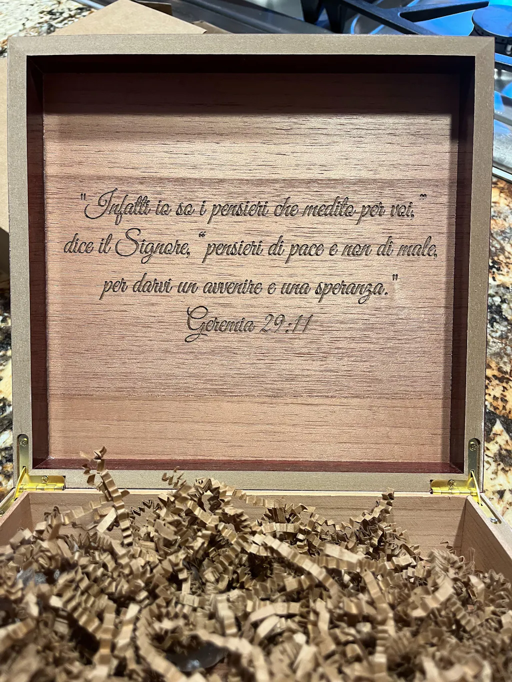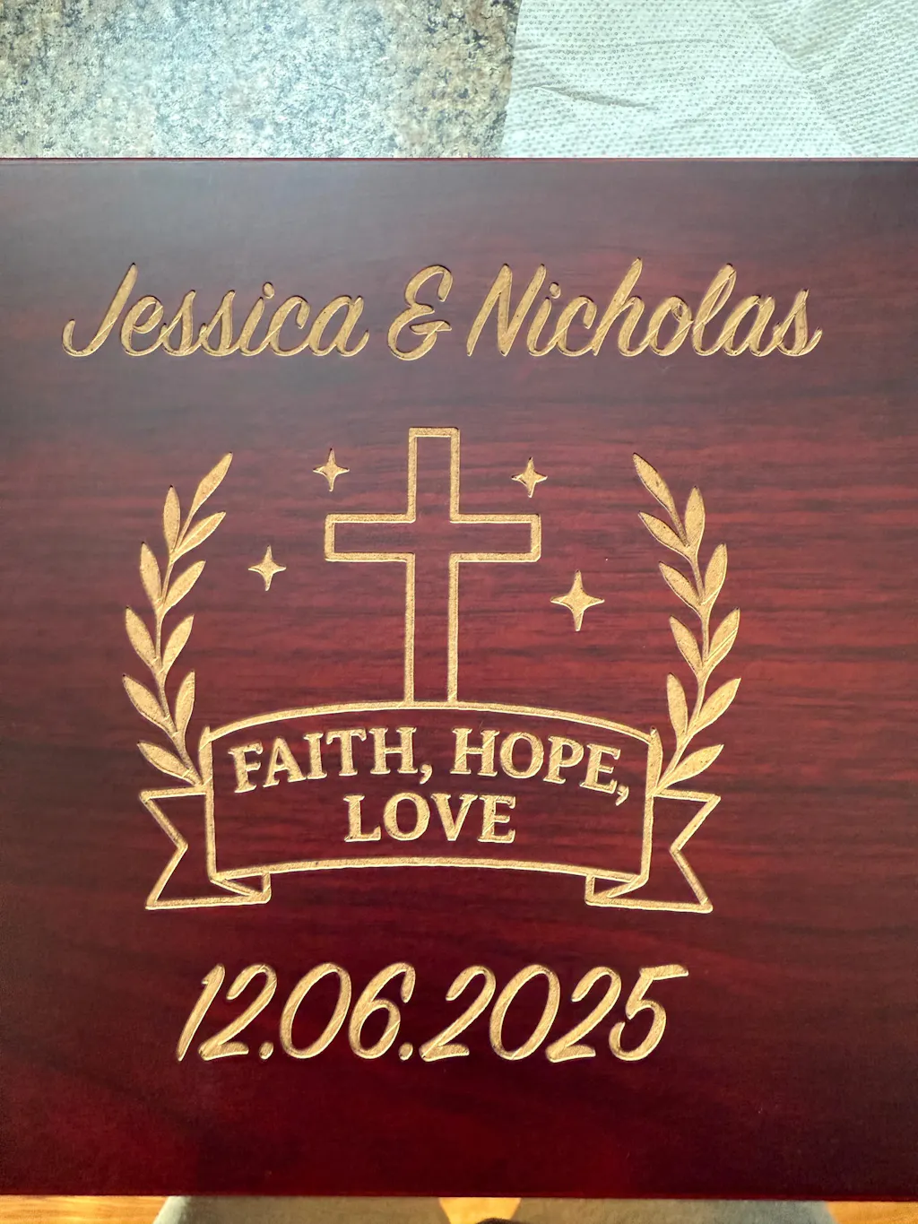 The final product - personalized men's wooden keepsake box, cherry - far exceeded our expectations for quality and beauty. The box itself is pretty and nicely made; the engraving on top and inside lid is perfectly executed and lovely; the packaging adds extra nice touches (professional, complete, thoughtful). Ordered the box as a gift for a baby's baptism in Italy. We will be proud to give.
