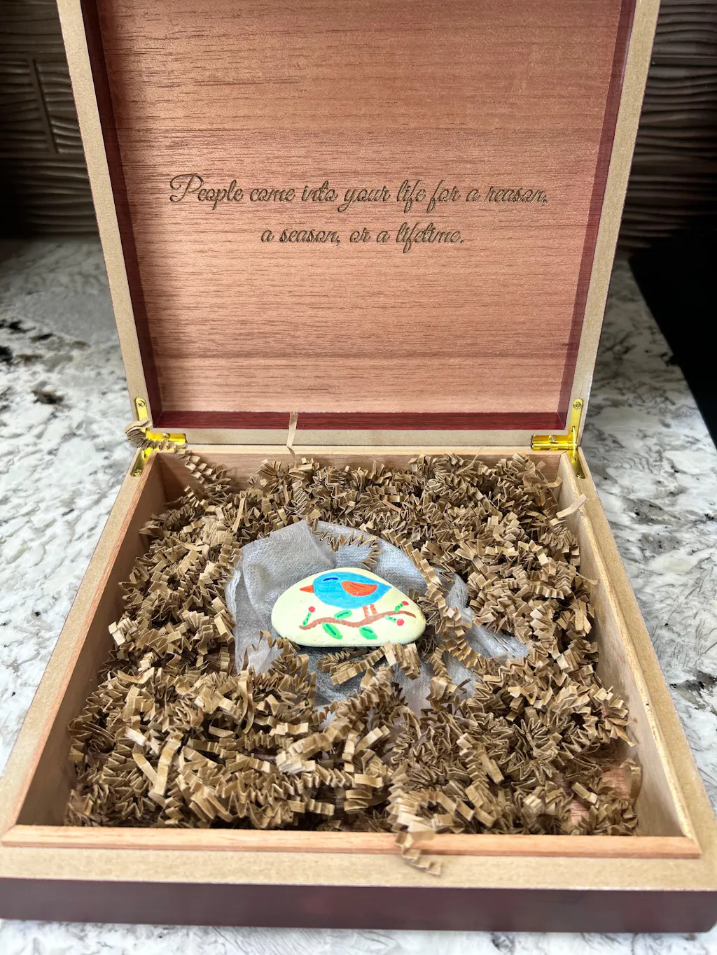 The keepsake box we ordered for our coworker was of exceptional quality for the price paid. And it was delivered very quickly. (The rock in the picture was added later.)