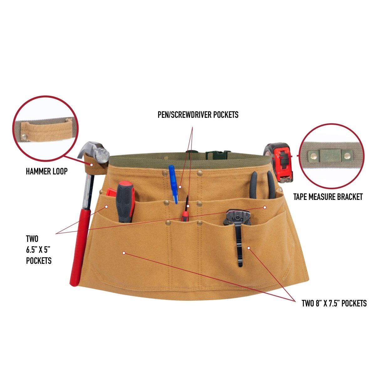 - Hardware: Hammer loop on right side, tape measure clip on left side