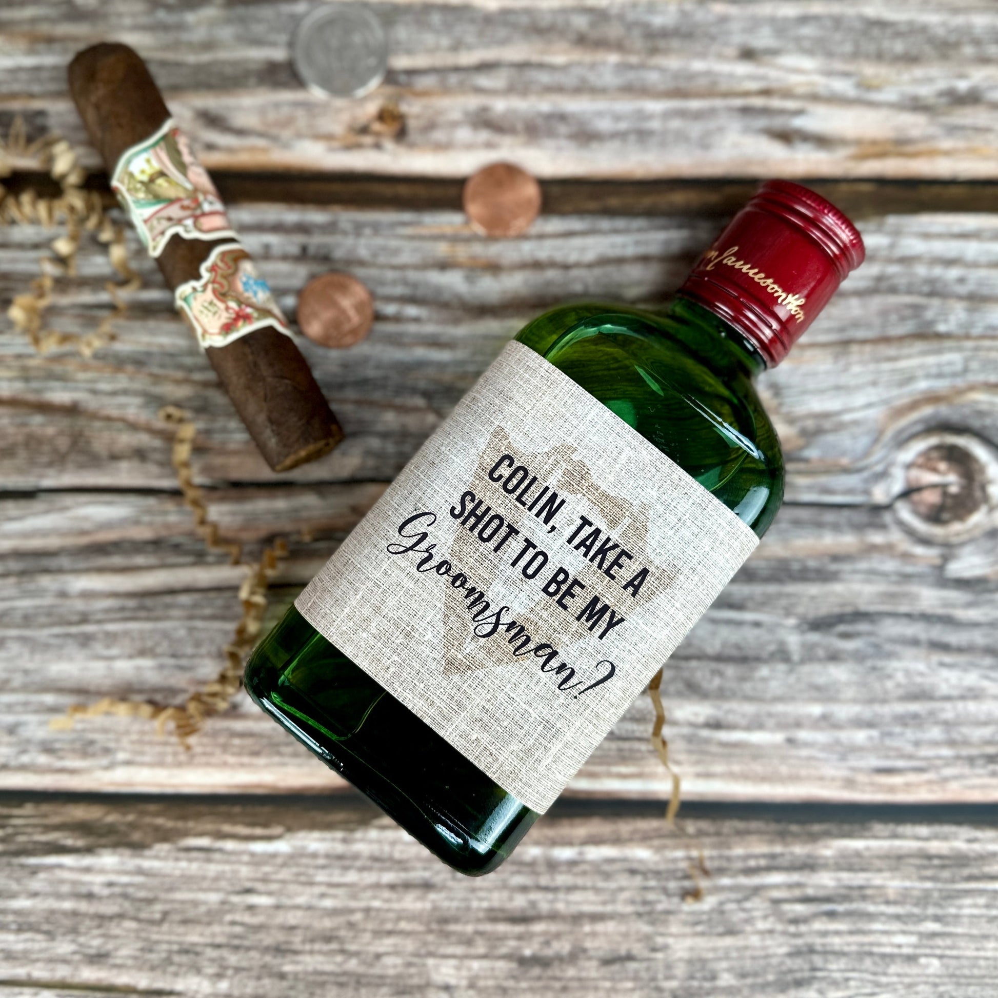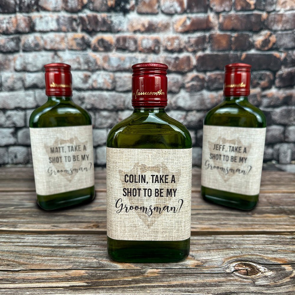 Ask your groomsmen to stand by your side with this personalized liquor bottle label. Each custom label features their name and wedding role, turning an ordinary bottle into a memorable proposal gift. Perfect for bachelor parties or individual asks, this label sticks to any standard liquor bottle.