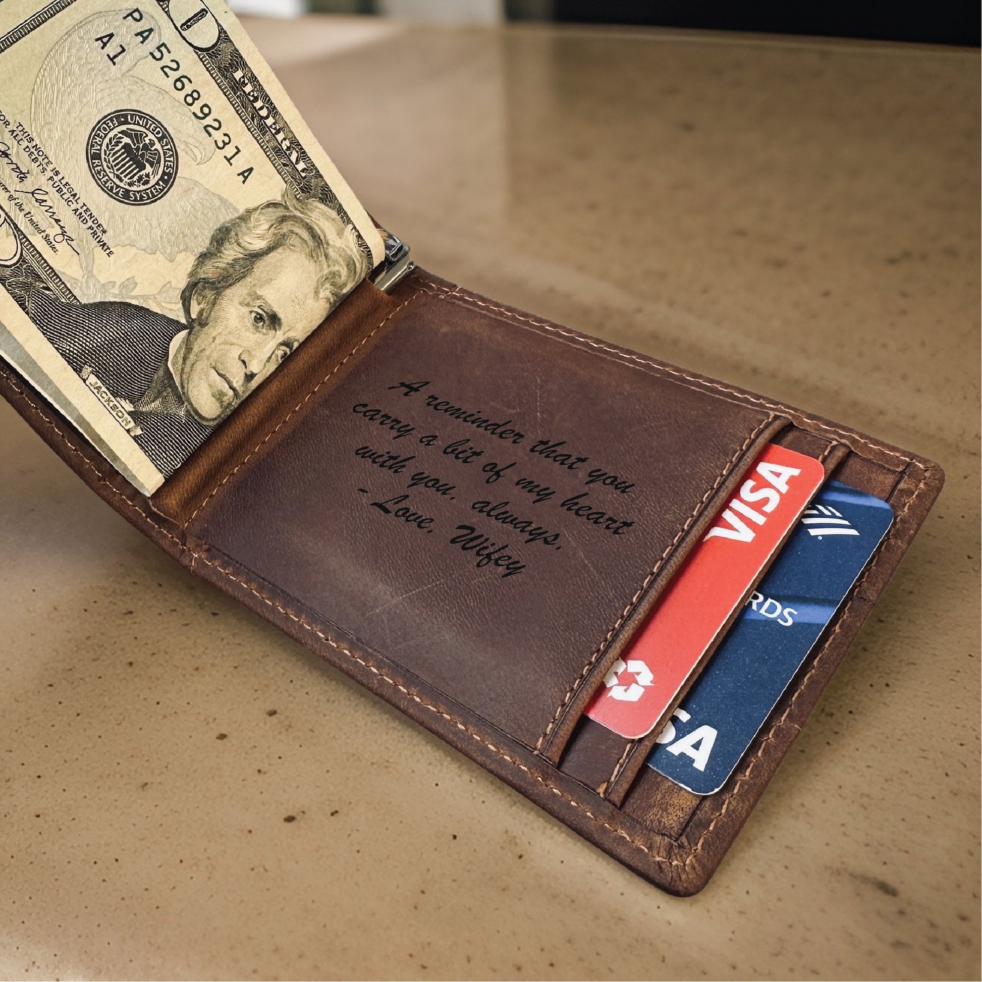 Each genuine leather wallet features custom exterior engraving with initials and personalized interior messages up to 150 characters.