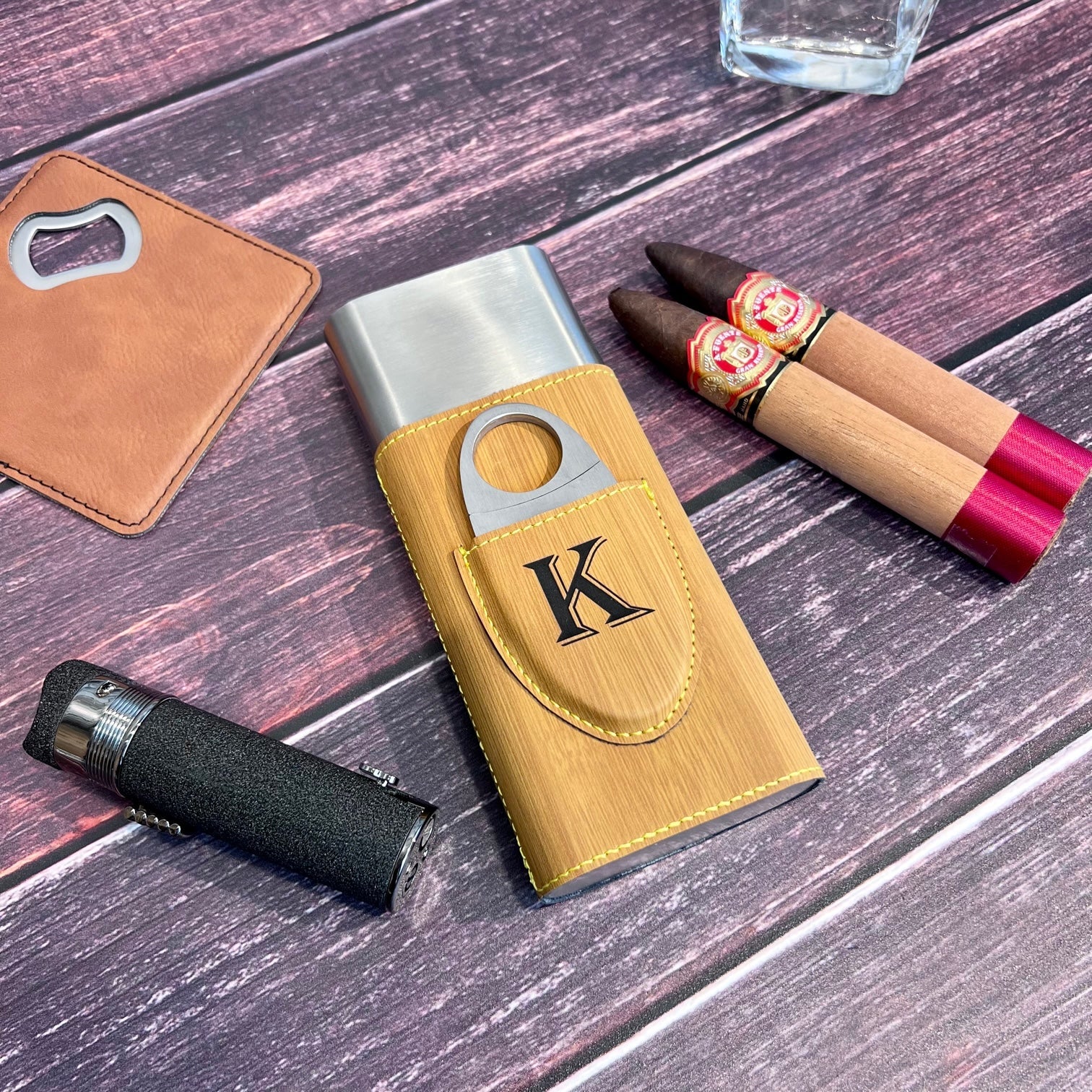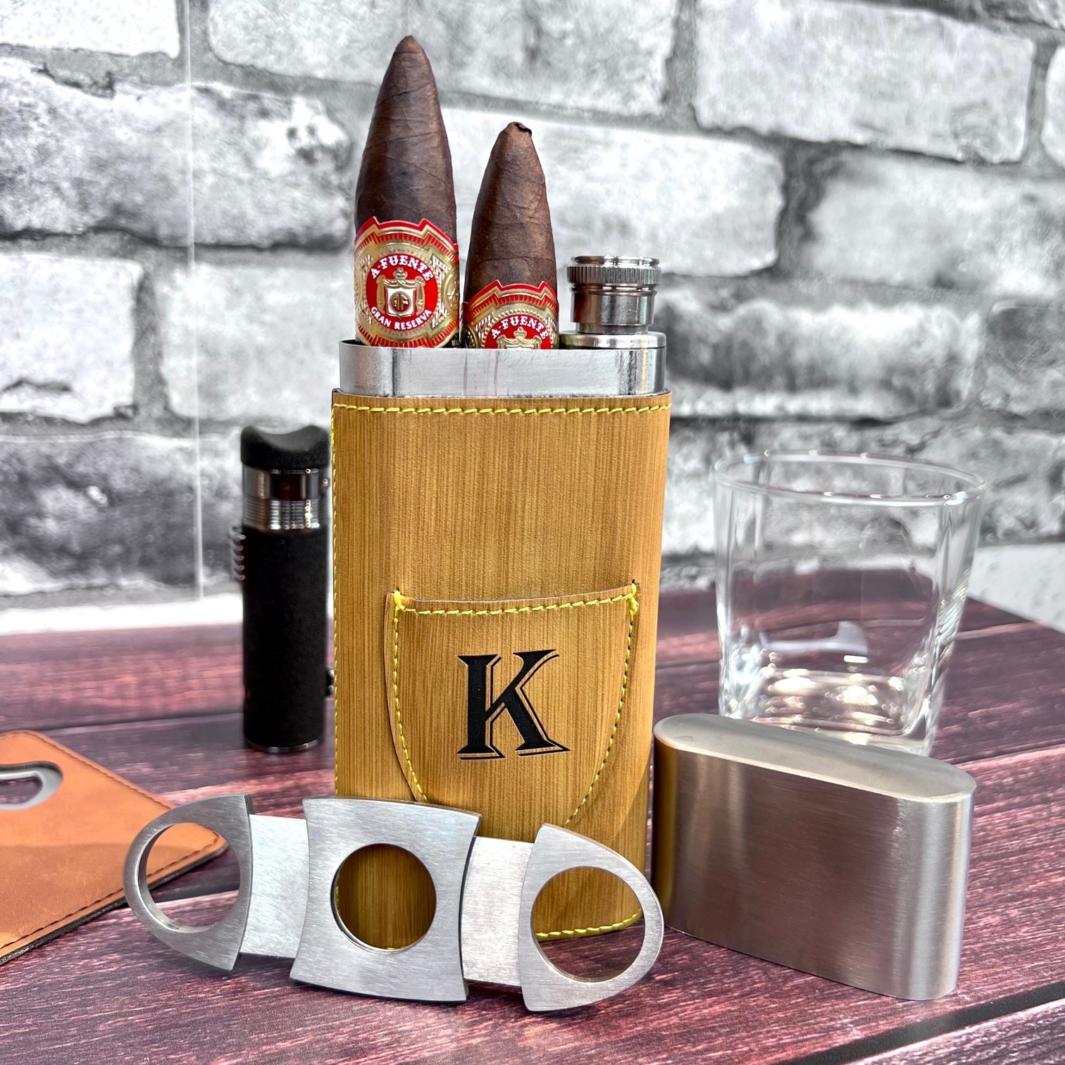 This slick cigar-carrying case doubles as a 2-ounce flask and includes a stainless steel cutter, ensuring cigars and spirits are always close at hand.