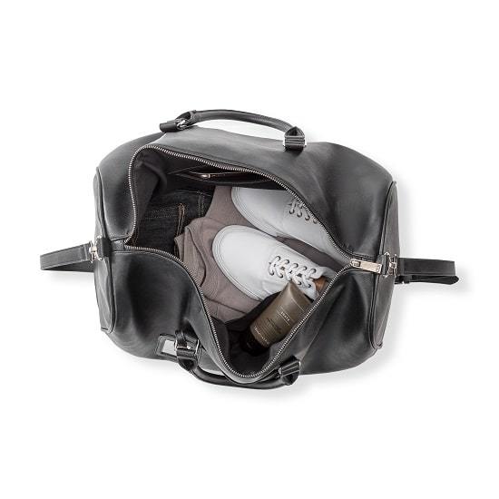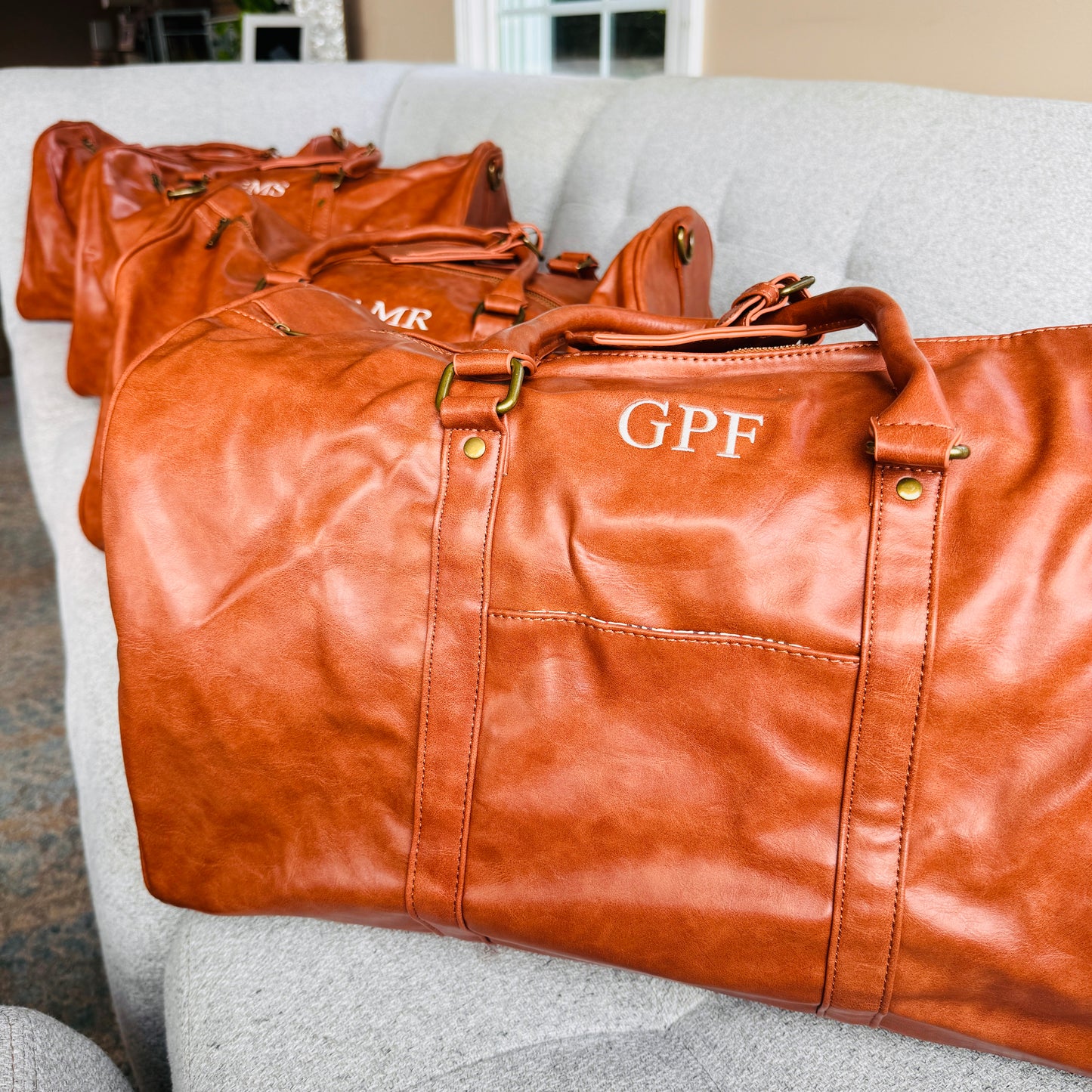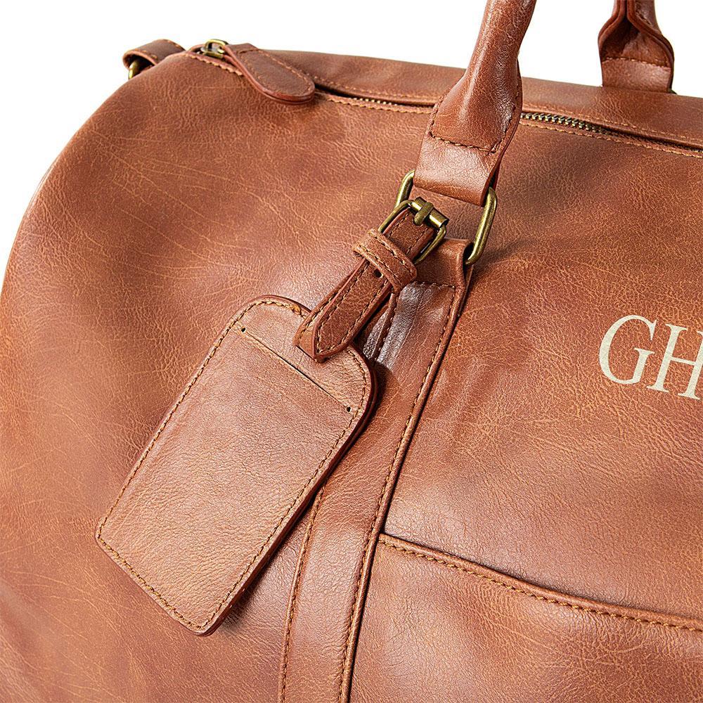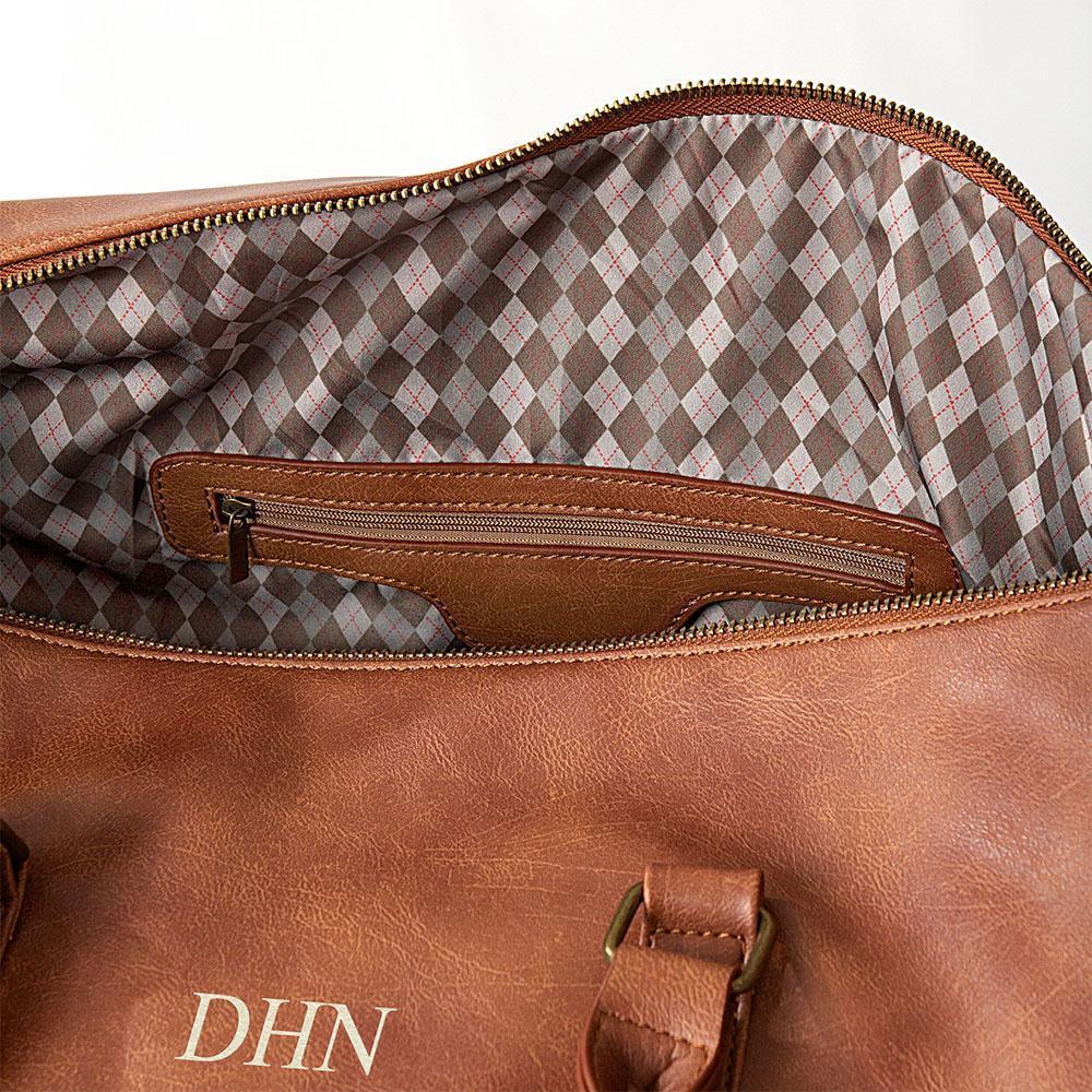 Each personalized vegan leather duffle features argyle lining, antique golden zippers, and custom embroidered initials.