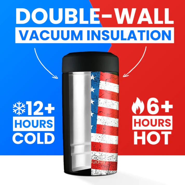 This insulated stainless steel cooler fits all standard beverage sizes—from slim cans to 16oz bottles—and maintains cold temperatures for over 12 hours or hot for 6+ hours.